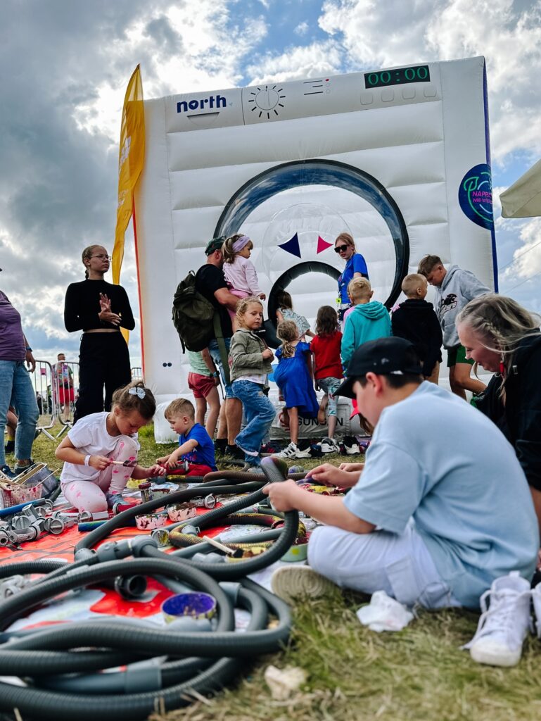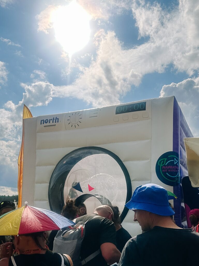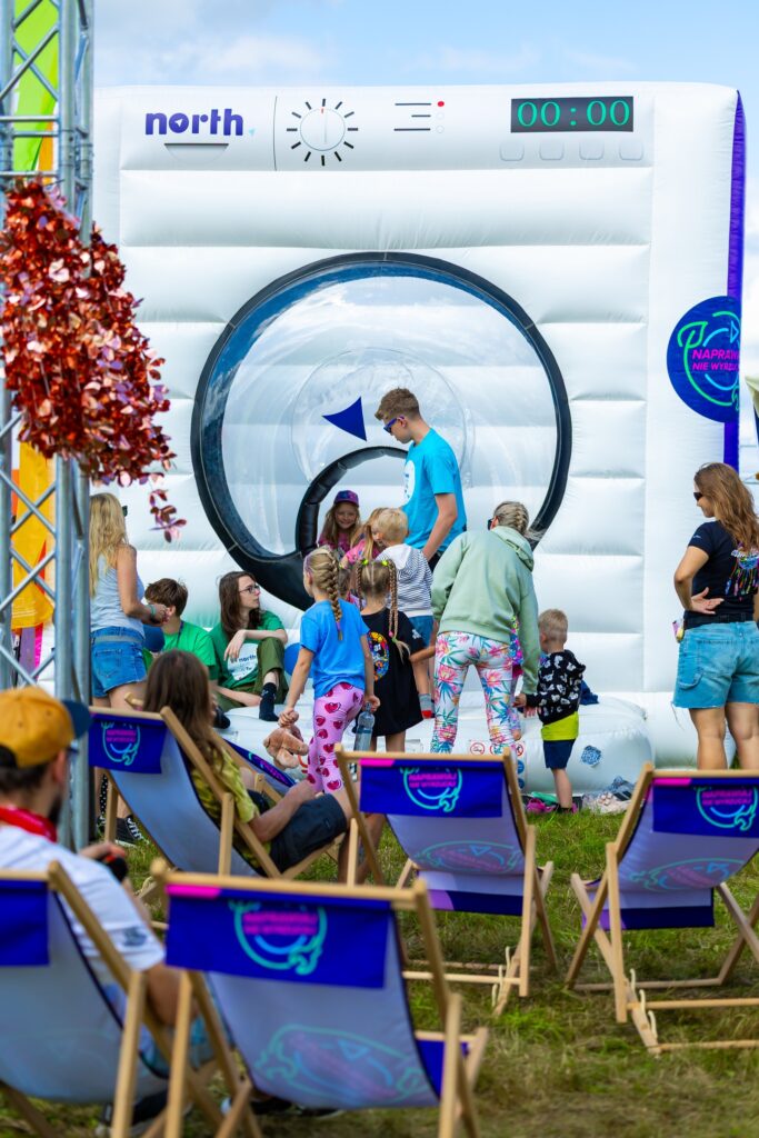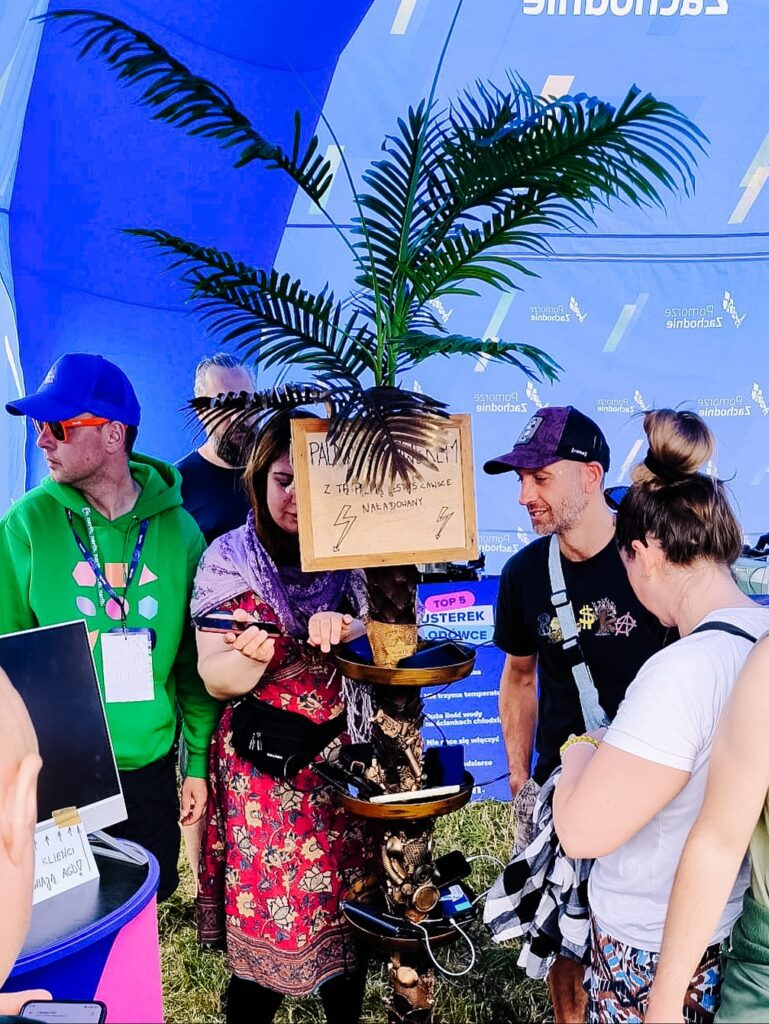 Stworzyliśmy „rzekę części”, w której można było wyławiać elektrośmieci i przekonać się, ile cennych surowców trafia do odpadów. Z odpadów powstała też festiwalowa palma – nie tylko symbol kreatywności, ale i… stacja ładująca. A na festiwalu, gdzie dostęp do kontaktu to prawdziwe złoto, była to jedna z najbardziej obleganych atrakcji.